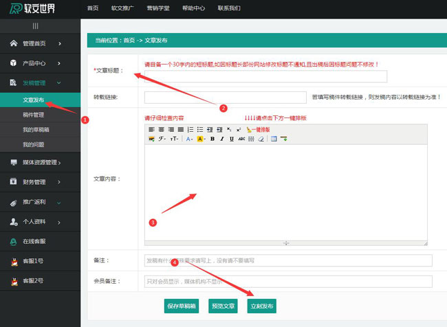 3、后臺發(fā)稿管理中,選擇“文章發(fā)布”,撰寫稿件,填寫標(biāo)題,已經(jīng)有來源的文章,直接添加轉(zhuǎn)載鏈接就可以了。
